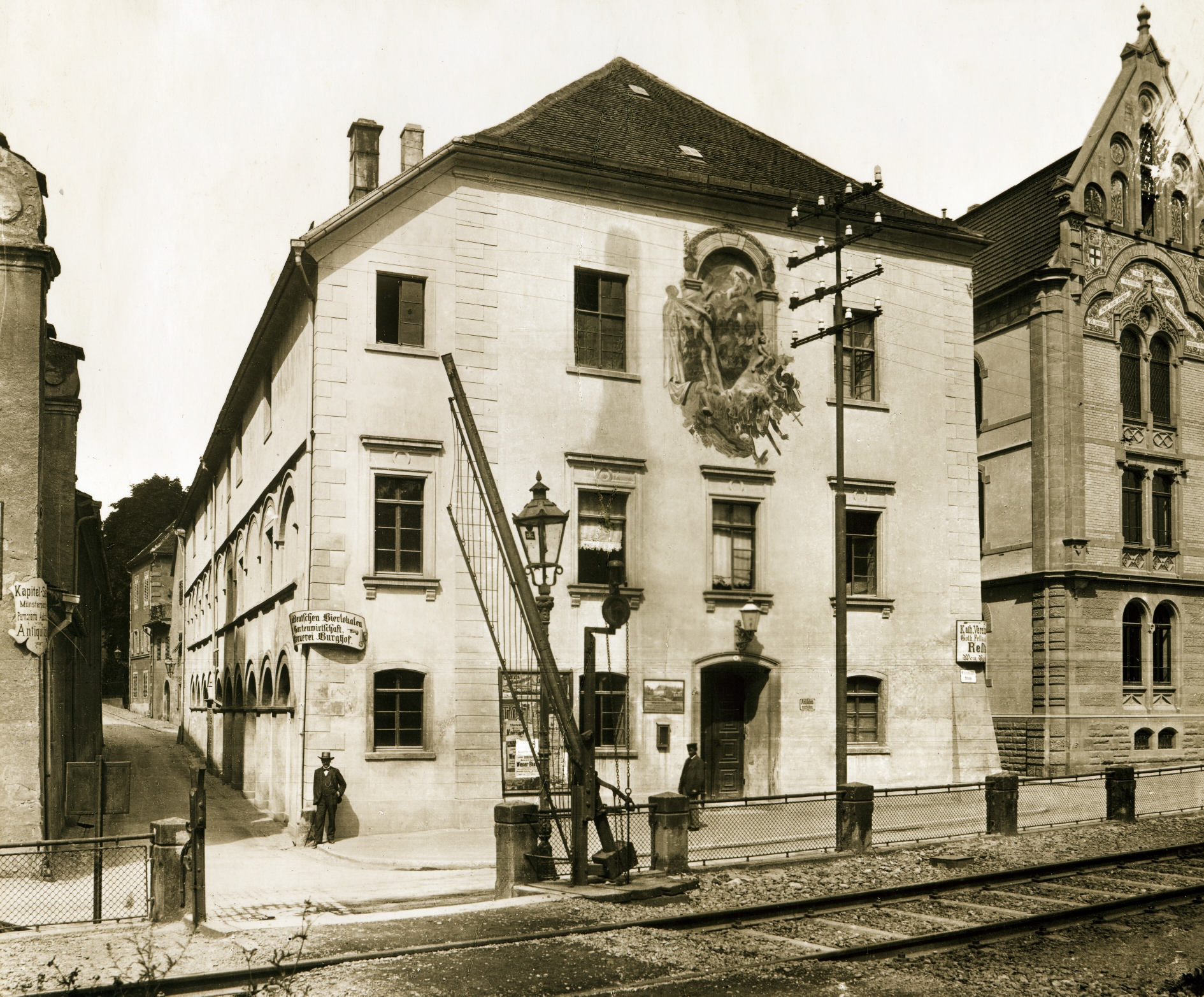 Ein Superlativ, aber es stimmt: Seit über 400 Jahren wird hier Theater gemacht. Angefangen hat es mit der Gründung einer Schule durch die Jesuiten. Baubeginn 1607. Die Holzsäulen im Erdgeschoss stammen noch aus dieser Zeit. Von Schülern werden geistliche Stücke aufgeführt, in lateinischer Sprache. Über Märtyrer und Heilige, aber auch Missionsgeschichten aus Ostasien. Fürs Publikum gibt es Programme mit deutscher Zusammenfassung. 1773 ist Schluss: Der Jesuitenorden wird aufgehoben, der Lehrbetrieb zieht ins frühere Kolleg nebenan. Zwei Bürger übernehmen das Schulgebäude und bauen um. Ein Saal entsteht, mit umlaufender Empore und Logen. An der Fassade bringt man ein Relief an: Die Vertreibung des Hanswurst von der Bühne - Harlekin & Co. purzeln aus dem Bild. Der Beginn des deutschen Theaters ist eine ernste Angelegenheit. Reisende Schauspieler*innen treten auf, wochenweise im Winter. Auf die Wandertruppen folgen Unternehmer, wirtschaftlich selbständige Intendanten - ein unsicheres Geschäft.