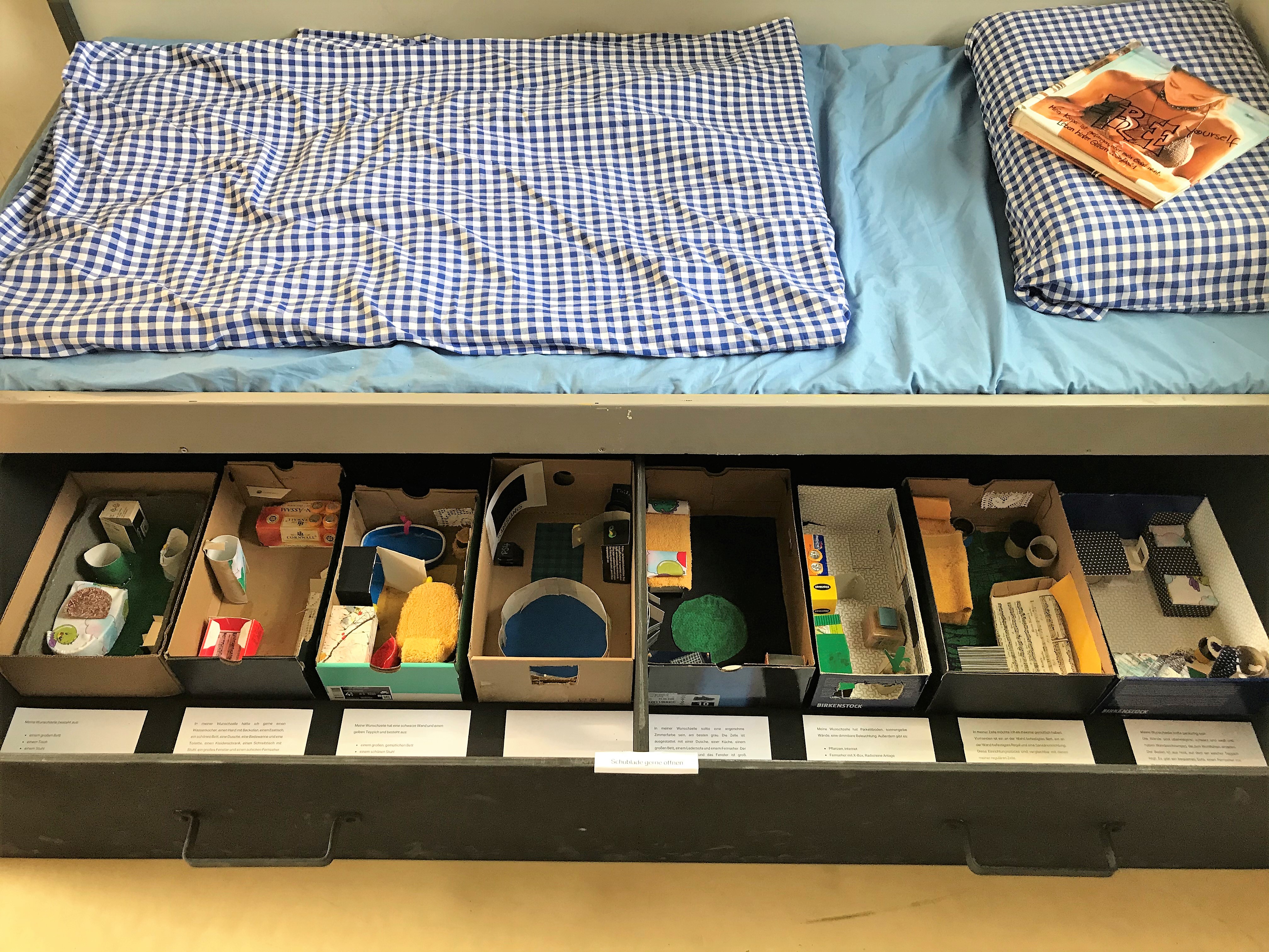 Die Größe des Containers entsprach der eines Haftraumes. Im Innern wurde das Originalmobiliar einer Strafanstalt sowie Texte, Bilder und Objekte von Inhaftierten ausgestellt.